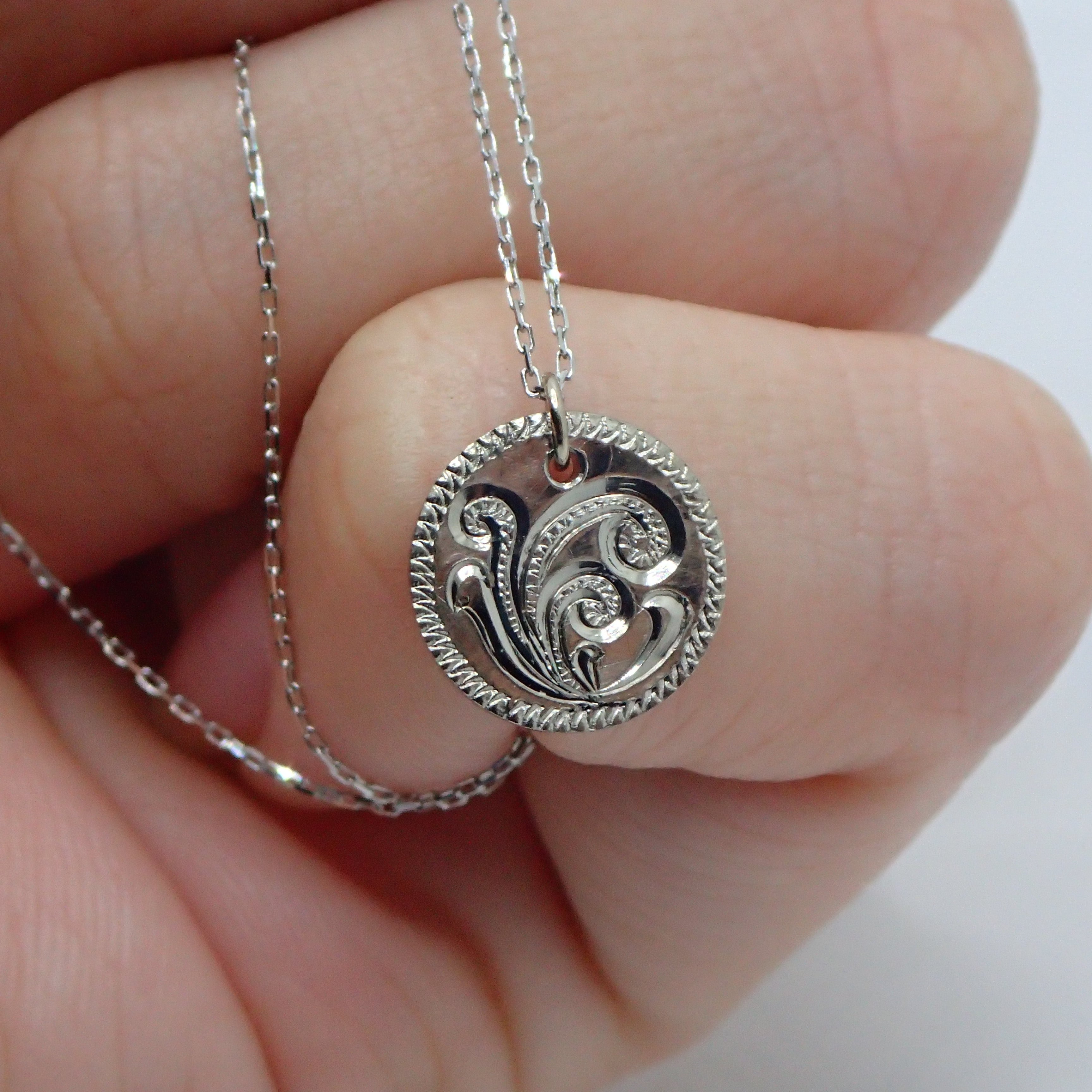 スクロール柄を彫ったネックレスになります。